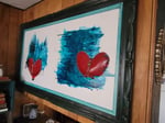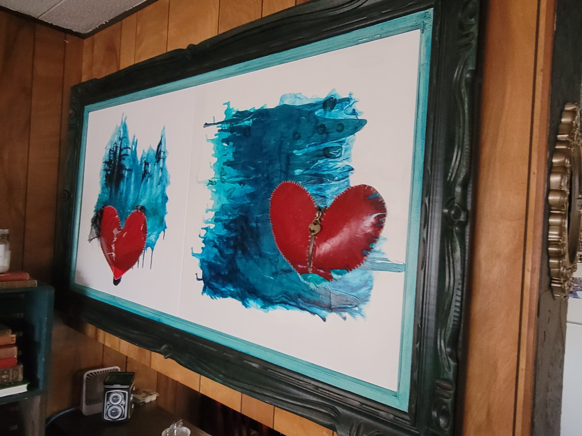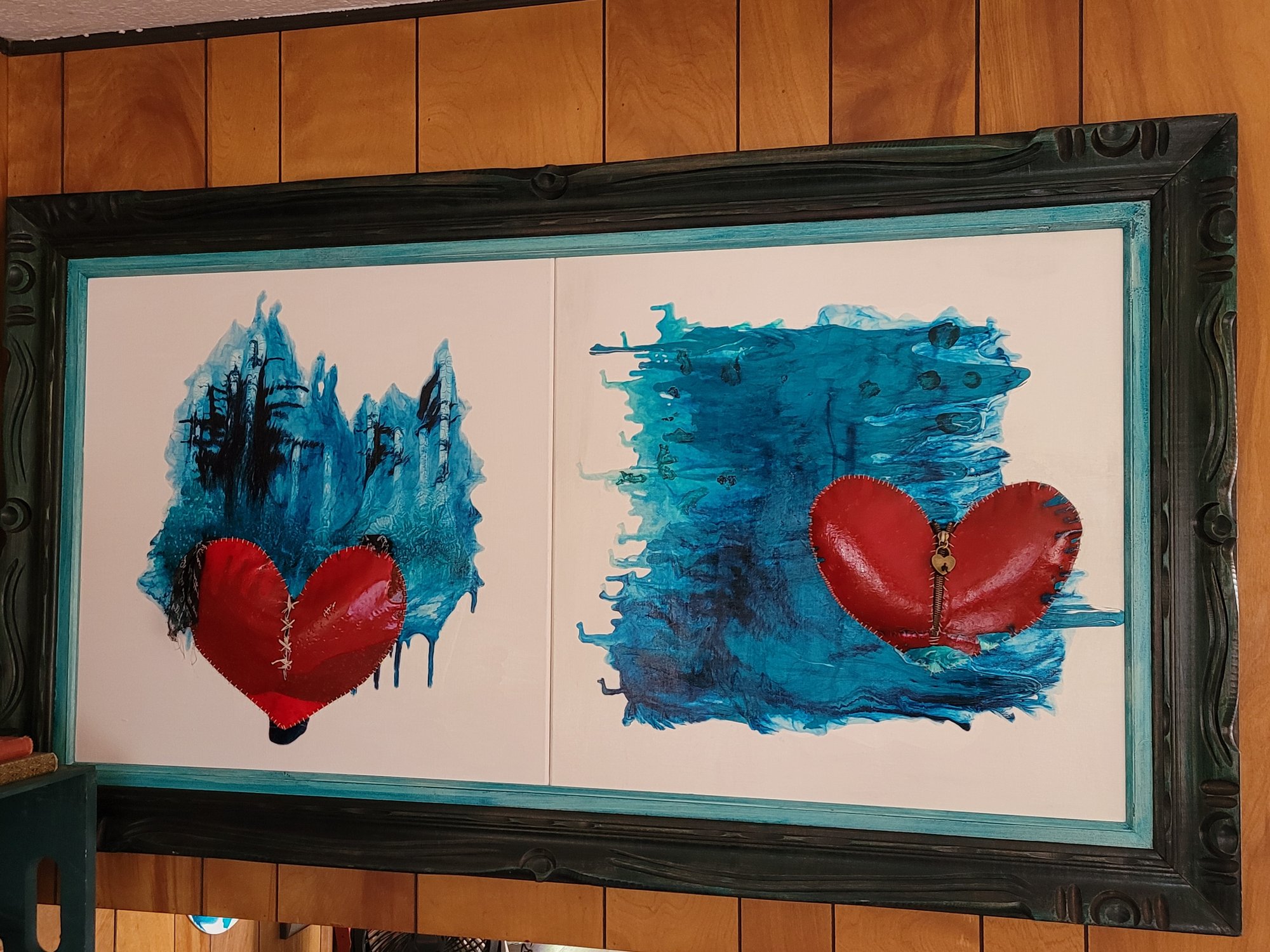 Multi-media double canvases framed in a vintage wooded teal frame.