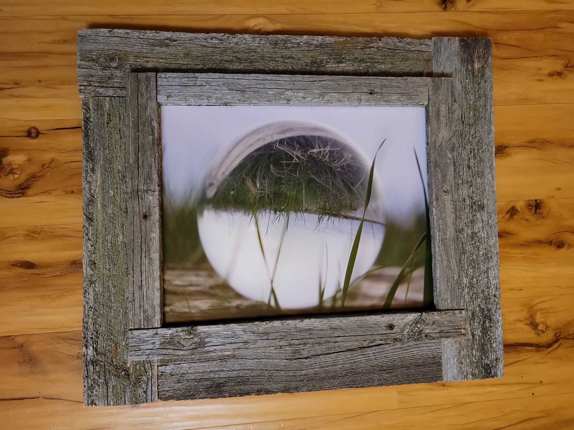 Print mounted on gatorboard and framed in a barnwood frame.